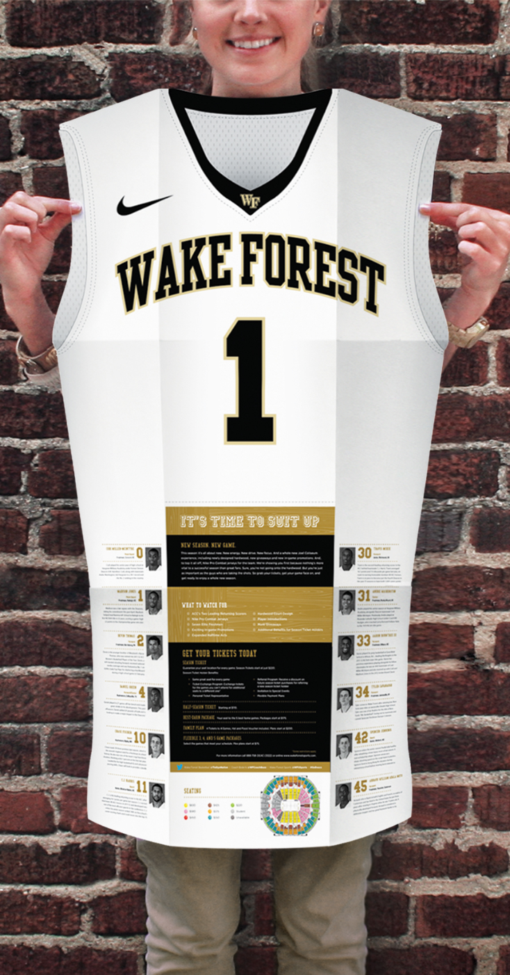 Wildfire worked with Wake Forest Athletics to create a season ticket mailer that built excitement for the upcoming men’s basketball season. Each mailer contained a life-sized jersey die cut complete with the recipient’s last name. Nearly every single person who received the mailer purchased season tickets.